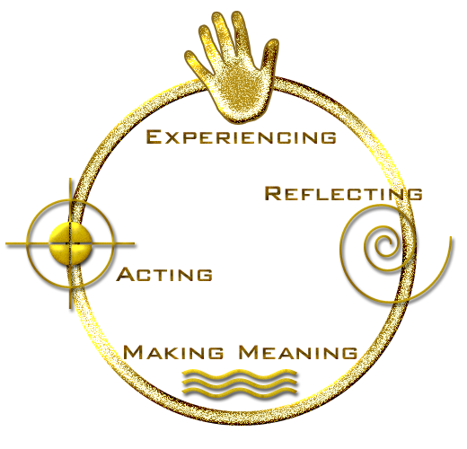 In the First Nations Experiential Learning Cycle illustration below, the elements have the simple yet powerful labels of Experiencing, Reflecting, Meaning Making, and Acting. These dynamic words reveal an engaged, deliberate, yet very open and aware process - one that is reflected in the traditional knowledge and learning processes, and has profound meaning in the 21st Century for students preparing to participate in Self Governance initiatives, and leadership positions within their communities.