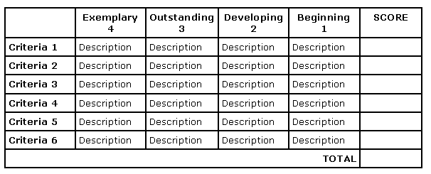 A good resource to help in developing the rubric is Rubistar4teachers at: http://rubistar.4teachers.org/