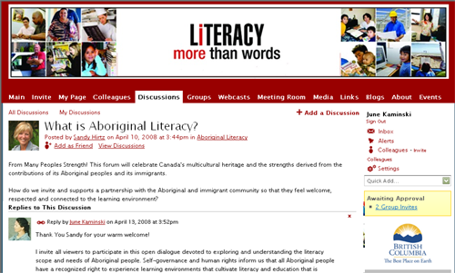 In April 2008, June Kaminski facilitated the launch of an Aboriginal Literacy forum discussion on the BC Literacy website. A call for partipation was put out to anyone interested in discussing literacy for First Nations peoples and what educators need to know/do to support this literacy