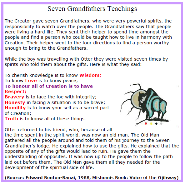 Respect has been a common theme of Elder teachings across diverse First Nations and Inuit nations for millennia, and has been adopted in time by Metis nations. he following traditional lesson about the Seven Sacred Teachings or Laws is called the Seven Grandfathers Teachings by the Anishinabe peoples from the Great Lakes area. However, the story is also told with slightly different contexts by other nations such as White Buffalo Calf Woman’s teachings from the Lakota and Sioux peoples; the Dene Laws by the Dene nation of the Northwest Territories, the Seven Laws by the Kwantlen Nation of British Columbia, and other names by other nations. The point is that these laws are quite universal across the First Nations, Inuit and Metis peoples.